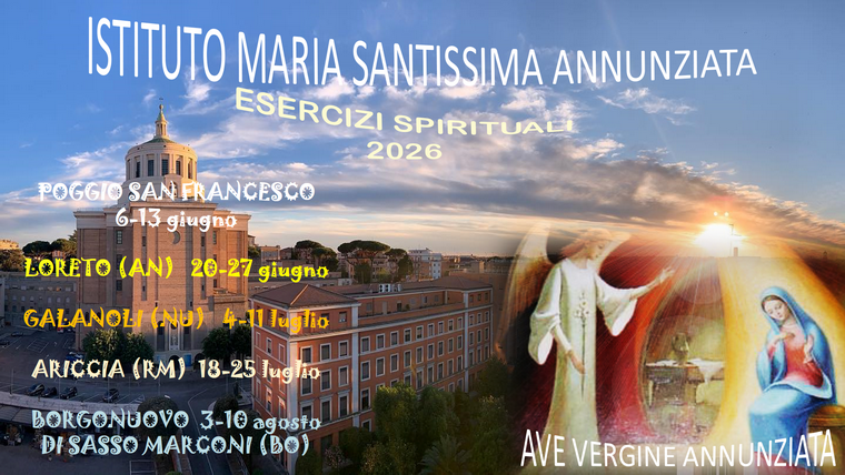 poche persone oggi si fermano a riflettere su se stessi, sul senso della vita e sugli immensi doni di Dio. Noi ogni anno facciamo un momento di sosta per ascoltare e accogliere la Parola di Dio, sull'esempio della Vergine dell'Annunciazione. Per questo ci chiamiamo "Annunziatine". Noi vogliamo, come Maria, accogliere e servire la Verità, vivere ed annunciare Gesù agli uomini di oggi. Perché non scegli anche tu di dare un po' del tuo tempo per ascoltare quella Parola che il tuo cuore attende da sempre?